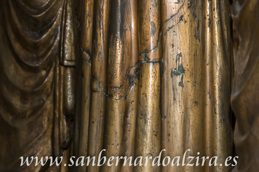 Las peripecias sufridas por esta centenaria escultura -incendio del templo, ocultación durante la confrontación civil, procesiones… unidas a las servidumbres que comporta el paso de los años- ha hecho mella en la imagen relicario. Por ello se constata la existencia de varias fisuras. La mayor abarca por completo el perímetro de la obra; la segunda, aparece a la altura del torso. El craquelado del estuco permite apreciar otros daños menores en el rostro, manos y faldones de la túnica. ¿En qué momento ocurrió esta fractura?