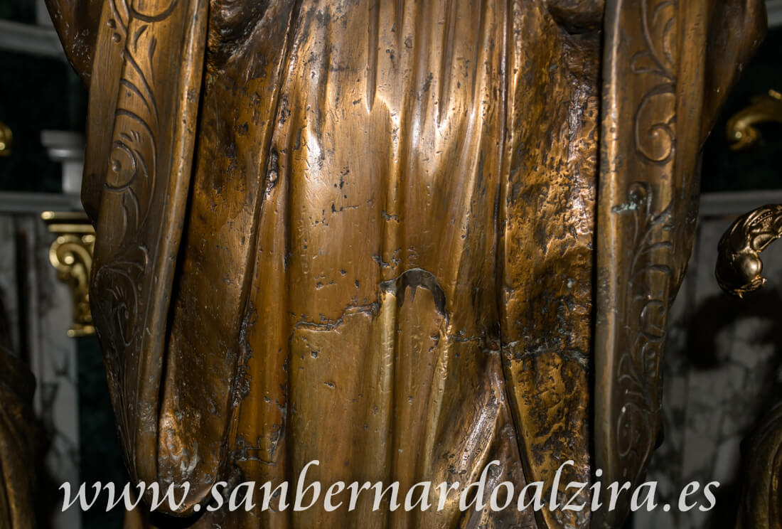 Estas incógnitas tal vez puedan ser desveladas si se procede a una restauración de la centenaria escultura Bernardina. Tal vez por su fragilidad que presentaba esta pieza, en 1966 la cofradía, presidida por Manuel Montagud, acordó preservar en su camarín la imagen relicario y encargar al escultor Ramón Granell, una réplica en madera de los tres santos.