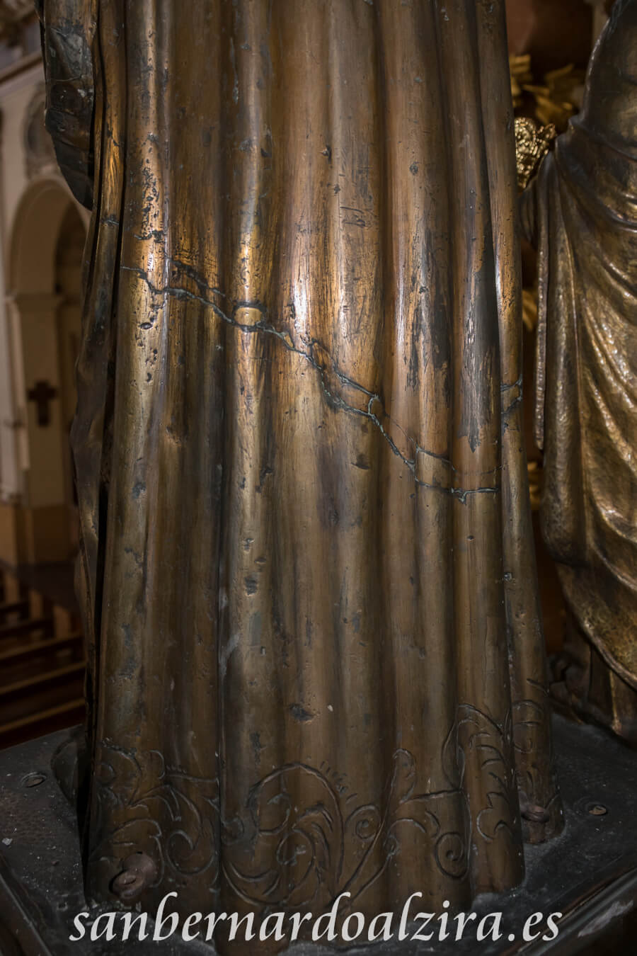 Aprovechando su eventual ubicación en el altar mayor -coyuntura ocasionada por las obras de restauración del retablo neobarroco y consolidación de las estructuras del templo donde se ubica) pude efectuar una medición aproximada de la obra.Altura de la peana: 10 cms. Altura S. Bernat sin corona: 100 cms. Diámetro de la corona: 23 cms. Cabeza: 15×12 cms. Manos: 11 cms. Amplitud mangas túnica: 30 cms. Amplitud base túnica: 34 cms. Amplitud cintura: 34 cms. Amplitud cuello: 9 cms. Ornamentación base. Escudo de Alzira. Rombo. (Corona, llave,barras). Clavo en la frente.
